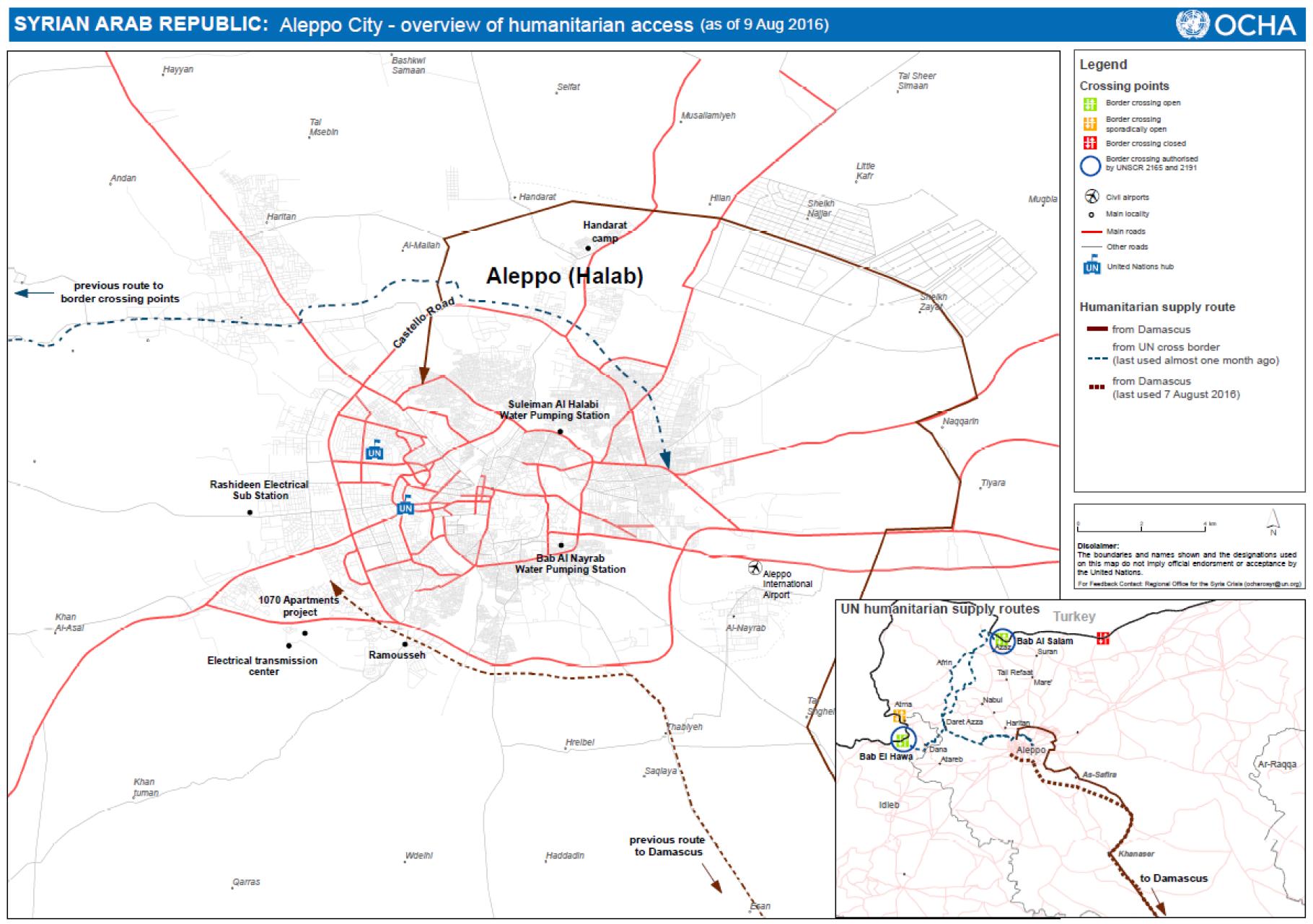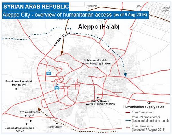 2) Además de los ataques aéreos y los bombardeos, los ataques contra las centrales eléctricas situadas al sur de la ciudad causaron un apagón en toda la ciudad. El corte de electricidad también detuvo temporalmente el servicio de suministro de agua en toda la ciudad. Sin acceso fiable a mercancías y con un aumento de los precios, el 13 de agosto el consejo local de la zona este de Alepo empezó a distribuir raciones de alimentos de sus existencias. El número de médicos en la zona este de Alepo es limitado, y se ha informado que en la zona hay solo 35.