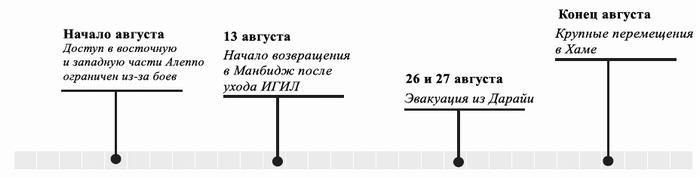 5. 13 августа, после 42 дней противостояния, Сирийские демократические силы при поддержке возглавляемой Соединенными Штатами международной коалиции против ИГИЛ полностью заняли город Манбидж и большие участки в сельских районах на восток от Алеппо. После ухода ИГИЛ, несмотря на сообщения о значительных проблемах в области защиты гражданского населения, особенно высокий уровень опасности, исходящей от самодельных взрывных устройств, в Манбидж вернулись десятки тысяч внутренне перемещенных лиц. Организации Объединенных Наций не удалось обеспечить маршрут для оказания гуманитарной помощи из-за сохраняющегося отсутствия безопасности в регионе. Сотни боевиков ИГИЛ, выбитых из Манбиджа, переместились в город Джарабулус на севере от Алеппо, захватив около 2000 мирных жителей в качестве «живого щита» во время перемещения. Впоследствии эти гражданские лица были отпущены на свободу.