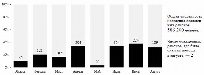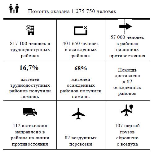 Основные моменты в августе 2016 года1) В августе продовольственную помощь получили 4,19 миллиона человек. Однако межучрежденческие автоколонны смогли доставить только 5 процентов помощи в осажденные и труднодоступные районы. В августе было направлено пять межучрежденческих автоколонн в 10 труднодоступных и осажденных районов.