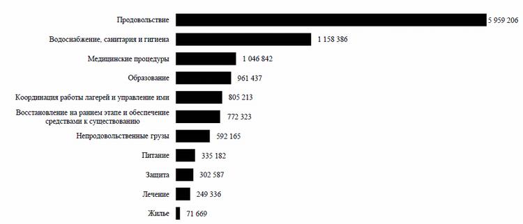 Число людей, получивших помощь из-за рубежа от Организации Объединенных Наций и ее партнеров, в разбивке по видам помощи, август 2016 года(В тысячах человек)
