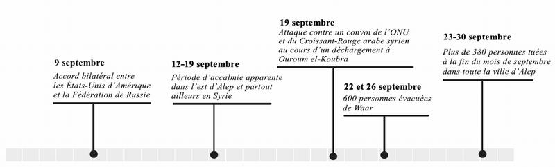 Date Lieu Type d'attaque Nombre de personnes tuées, y compris les femmes et les enfants Nombre de personnes blessées Type d'infrastructure ou de site Province d'Alep 4 septembre Zahra Frappe terreste 10, dont 2 femmes - - 6 septembre Sakhour (est d'Alep) Bombe (apparemment toxique) - Plus de 70 Résidentiel 18 septembre Sakhour (est d'Alep) Frappe aérienne 1 8 dont 5 enfants Résidentiel 19 septembre Ouroum el-Koubra (ouest d'Alep) À confirmer 18 À confirmer Convoi d'aide 23 septembre Divers districts (est d'Alep) Frappes aériennes Plus de 50 - Résidentiel 24 septembre Tariq el-Bab (est d'Alep) Frappe aérienne 5 - Résidentiel 24 septembre Mashad (est d'Alep) Frappe aérienne 7, dont 5 enfants - Résidentiel 24 septembre Boustan el-Qasr (est d'Alep) Frappe aérienne 5, dont 1 enfant - Résidentiel 24 septembre Firdaous (est d'Alep) Frappe aérienne 18 - Résidentiel 25 septembre Sakhour (est d'Alep) Frappe aérienne 6 - - 25 septembre Salaheddin (est d'Alep) Frappe aérienne 6, dont enfant - Résidentiel 25 septembre Boustan el-Qasr (est d'Alep) Frappe aérienne 13 150 Résidentiel 28 septembre Sakhour (est d'Alep) Frappe aérienne 2 - Hôpitaux 25 septembre Maadi (est d'Alep) Frappe aérienne 6 - Commerce (boulangerie) Province de Damas 13 septembre Masaken Barzé (Damas) Frappe terrestre 1 enfant - Résidentiel 17 septembre Qaboun (Damas) Frappe terrestre - 3 Résidentiel Province de Deraa 11 septembre Hara Frappe terrestre 2 enfants 1 - 18 septembre Da'el Frappe aérienne 10, dont 1 enfant Au moins 25 - Province de Deïr el-Zor 1er septembre Mehmidé Frappes aériennes 10, dont 4 femmes et 3 enfants - - 2 septembre Tayana Frappe aérienne 5, dont 3 femmes et 1 enfant 12 Résidentiel 6 septembre Qoussour et Joura (ville de Deïr el- Zor) Frappe terrestre 4 3 10 septembre Qoussour et Joura (ville de Deïr el- Zor) Frappe terrestre 5 civils,, dont 1 femme et 1 enfant 14 septembre Qoussour et Joura (ville de Deïr el- Zor) Frappe terrestre 3, dont 1 femme Au moins 2 Résidentiel 15 septembre Mayadin Frappe aérienne Au moins 23, dont 1 femme et 9 enfants 10 - 19 septembre Mayadin Frappe aérienne Au moins 5, dont 1 enfant 15 Résidentiel 19 septembre Tibni Frappe aérienne 6, dont 2 femmes et 2 enfants - Résidentiel 23 septembre Mohsen Frappe aérienne 4, dont 2 enfants - Résidentiel Province de Tartous 5 septembre Divers Bombes (véhicules piégés et attentats-suicides à la voiture piégée) Au moins 43 Des dizaines Divers Province d'Edleb 12 septembre Maaret Misrin Frappes aériennes Au moins 13 - Résidentiel et commercial Province de Rif-Damas 2 septembre Douma Frappes aériennes 1 femme et 1 enfant 12 septembre Douma Frappe terrestre Au moins 13 16 septembre Afra et Deïr Moqren Frappe terrestre 1 - Résidentiel 25 septembre Khan el-Chih Frappes aériennes Au moins 4 Au moins 5 Résidentiel 2 Véhicule - Exploitations agricoles Source : HCDH.