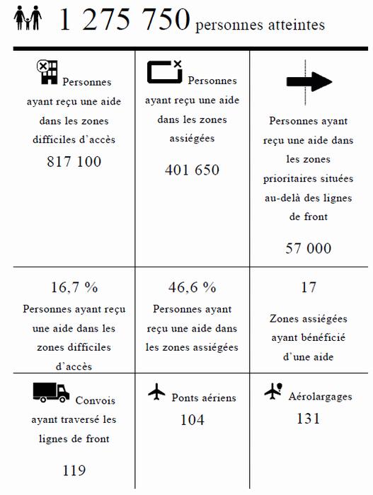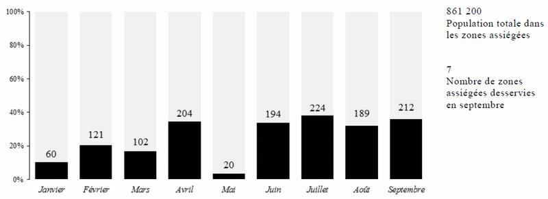 2) Le nombre de personnes vivant dans des zones assiégées en Syrie est passé de 586 200 à 861 200, l'est d'Alep ayant été déclaré le 29 septembre comme réunissant les trois critères qui définissent une zone assiégée : encerclement militaire, absence d'accès humanitaire et privation de la liberté de circulation pour les civils.