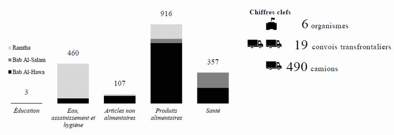Organisme Nombre de bénéficiaires Organisation des Nations Unies pour l'alimentation et l'agriculture 59 814 Organisation internationale pour les migrations 38 700 Haut-Commissariat des Nations Unies pour les réfugiés 518 000 Fonds des Nations Unies pour l'enfance 2 200 000 Programme des Nations Unies pour le développement 1 381 010 Fonds des Nations Unies pour la population 207 101 Office de secours et de travaux des Nations Unies pour les réfugiés de Palestine dans le Proche-Orient 450 000 Programme alimentaire mondial 4 100 000 Organisation mondiale de la Santé 525 748 26. Au cours de la période considérée, les livraisons transfrontalières à partir de la Turquie et de la Jordanie à destination de la République arabe syrienne se sont poursuivies en application des résolutions 2165 (2014), 2191 (2014) et 2258 (2015) du Conseil de sécurité (pour plus de détails, voir fig. III). Conformément à ces résolutions, l'ONU a notifié à l'avance chaque livraison aux autorités syriennes, y compris le contenu, la destination et le nombre de bénéficiaires. Le Mécanisme de surveillance de l'aide humanitaire en République arabe syrienne a poursuivi ses opérations et contrôlé 490 camions dans les 19 convois de septembre, confirmé la nature humanitaire de chacun et informé les autorités syriennes de chaque expédition. Il a continué de bénéficier de la coopération active des Gouvernements jordanien et turc.