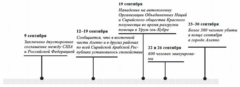 Основные факты, сентябрь 2016 года(1) Договоренность между Соединенными Штатами Америки и Российской Федерацией, достигнутая 9 сентября, не была выполнена. В последнюю неделю сентября в восточной части Алеппо погибло более 300 человек, главным образом в результате воздушных ударов. За то же время в западной части Алеппо погибло более 80 человек.