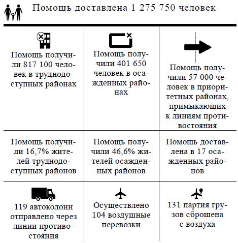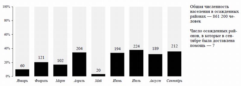 (4) 19 сентября был представлен план отправки совместных автоколонн на октябрь. Согласно нему, в октябре планируется доставить помощь в 29 осажденных и труднодоступных районов, а также приоритетных районов, примыкающим к линиям противостояния, охватив 962 800 человек, нуждающихся в помощи.