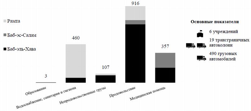 (4) Каждый месяц партнеры, занимающиеся вопросами продовольственной безопасности, доставляют продовольственные наборы в среднем почти 6 миллионам человек (в том числе 1,5 миллиону человек — благодаря доставке помощи автоколоннами из-за границы), и еще более 2 миллионов человек ежемесячно получают помощь в виде пшеницы и муки/хлеба, которые распределяются непосредственно среди домашних хозяйств или среди местных пекарен. Каждый месяц по дорогам страны следует более 3000 грузовиков с продовольственной помощью. Благодаря этому только за последние восемь месяцев было доставлено почти 40 000 тонн пшеничной муки (в среднем по 5000 тонн в месяц). Главные оперативные трудности — это ограничения в плане доступа, опасная обстановка на дорогах и нехватка ресурсов. Несмотря на это, помощь от гуманитарных организаций получают в среднем 90 процентов лиц из числа внутренне перемещенных лиц, жителей испытывающих большую нагрузку принимающих общин и палестинских беженцев.