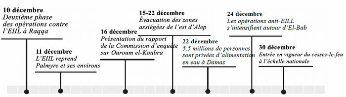 Date Lieu Type d'attaque Nombre de morts, femmes et enfants compris Nombre de blessés Type d'infrastructure ou de site Province d'Alep 4 décembre Hallak (quartiers est d'Alep) - 4, et 1 enlèvement - - 6 décembre Massaken el-Firdaous (quartiers est d'Alep) Frappe aérienne 5 Au moins 12 Zone résidentielle 7 décembre Meïsaloun Frappe terrestre 3, dont 2 enfants 8 décembre Kallassé, Maadi, Firdaous et Seïf el-Daoula (quartiers est d'Alep) Frappes aériennes et terrestres Au moins 40 Un grand nombre - 9 décembre El-Bab Frappes aériennes Au moins 18, dont 2 femmes et 6 enfants Au moins 8 Zone résidentielle 9 décembre Jaloum (quartiers est d'Alep) Frappes aériennes Au moins 25, dont 6 femmes et 9 enfants - - 12 décembre Divers districts de l'est d'Alep Tirs à l'arme à feu Au moins 82, dont 11 femmes et 16 enfants - - 14 décembre Jamiliyé (quartiers ouest d'Alep) Frappe terrestre 3, dont 1 enfant - - 18 décembre El-Bab Frappe terrestre 3, dont 1 enfant Au moins 2 Zone résidentielle 22 décembre El-Bab Frappe aérienne Au moins 95, dont des femmes et des enfants Au moins 47 Zone résidentielle 23 décembre El-Bab Frappe aérienne Au moins 24, dont des femmes et des enfants 68 27 décembre El-Bab Frappes aériennes et terrestres 4 6 Zone résidentielle 28 décembre El-Bab Mines Au moins 4 femmes et 1 enfant - - 29 décembre El-Bab Mines 6 enfants - - 30 décembre El-Bab Frappes aériennes et terrestres Au moins 10 15 Zone résidentielle Province de Damas 21 décembre Maliki et Abou Roummané (ville de Damas) Frappe terrestre Au moins 2 Zone résidentielle 29 décembre Jaoudet el-Hachimi (ville de Damas) Frappe terrestre Au moins 6 Province de Deraa 11 décembre Deraa el-Balad (ville de Deraa) Frappe terrestre 2 enfants - Zone résidentielle Province de Deïr el-Zor 2 décembre Joura (ville de Deïr el-Zor) Frappe terrestre 1 femme et 1 enfant 4 Zone résidentielle 5 décembre Zone frontalière (République arabe syrienne / Turquie) Tirs à l'arme à feu 1 Zone frontalière 7 décembre Hrabech (ville de Deïr el-Zor) Tirs à l'arme à feu 1 enfant - - 11 décembre Khcham Frappes aériennes Au moins 4 - Zone résidentielle 13 décembre Joura (Deïr el-Zor) Frappe terrestre 1 femme et 1 enfant - Zone résidentielle 20 décembre Mouh Hassan Frappes aériennes 4, dont 1 femme 2 Zone résidentielle 23 décembre Hatla Frappes aériennes 3 femmes et 2 enfants - Zone résidentielle 27 décembre Hajna Frappes aériennes Au moins 14, dont 2 femmes et 3 enfants 15 Zone résidentielle Province d'Edleb 18 décembre Fouaa Tirs à l'arme à feu 1 Plusieurs bus se trouvant à 15 km au sud de la ville Province de Hassaké 7 décembre Qamichli Engin explosif improvisé 6 3 Voie routière Province de Homs 19 décembre Waar Frappes terrestres - 2 enfants École Province de Raqqa 5 décembre Jerniyé Frappe aérienne 6 - - 5 décembre Zone frontalière (République arabe syrienne / Turquie) Tirs à l'arme à feu 1 Frontière 6 décembre Abbara Frappe aérienne 3, dont 1 enfant - - 7 décembre Méchrerfé Frappe aérienne 18, dont des femmes et des enfants 8 Zone résidentielle 9 décembre Maïzaïlé Frappe aérienne Au moins 28, dont 3 femmes et 4 enfants - Zone résidentielle 12 décembre Dallé (ville de Raqqa) Frappe aérienne Au moins 21, dont 1 femme et 5 enfants - - 20 décembre Hay el-Thani (ville de Tabqa) Frappe aérienne 4, dont 1 femme et des enfants Au moins 10 - Province de Rif-Damas 5 décembre Madaya Frappe terrestre 4, dont 1 enfant 20 - 11 décembre Douma Frappes aériennes et terrestres Au moins 4 Zone résidentielle 23 décembre Ouadi Barada Frappe terrestre Au moins 8 Jusqu'à 10 Zone résidentielle 29 décembre Douma Frappes aériennes et terrestres Au moins 14, dont 2 femmes et 6 enfants Zone résidentielle 29 décembre Irbin Frappe aérienne 4, dont 1 femme et 2 enfants 19 Zone résidentielle Source : Haut-Commissariat des Nations Unies aux droits de l'homme.
