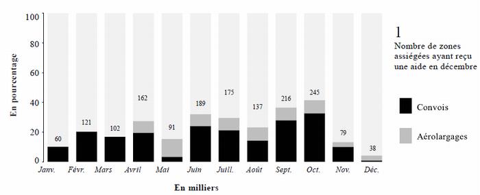 Opérations humanitaires menées conjointement par plusieurs organismes des Nations Unies dans les zones situées au-delà des lignes de front : nombre d'habitants des zones assiégées ayant bénéficié d'une aide, y compris au moyen d'aérolargages sur la ville de Deïr el-Zor, par mois