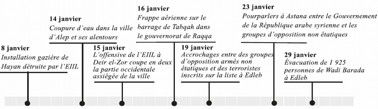 Points essentiels pour janvier 20171) Le cessez-le-feu entré en vigueur le 30 décembre tient toujours et si l'on a pu relever un certain nombre de violations, notamment à Edleb et Rif Dimashq, il a néanmoins entraîné une diminution des combats au cours du mois.