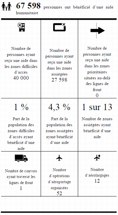 Points essentiels concernant l'accès humanitaire1) Il ressort d'un examen global mené par l'Organisation des Nations Unies qu'à la fin de janvier 2017 quelque 643 780 personnes vivaient dans 13 zones assiégées. Les quartiers est d'Alep, de Muaaddamiyah al-Sham et de Hajar el-Assouad ont été officiellement retirés de la liste des lieux ou zones assiégés, qui n'a pas fait l'objet d'inscriptions nouvelles. Quelque 4 millions de personnes vivent dans des zones difficiles d'accès.