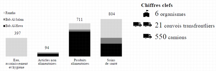 39. Au cours de la période considérée, les livraisons transfrontalières à partir de la Turquie et de la Jordanie à destination de la République arabe syrienne se sont poursuivies en application des résolutions 2165 (2014), 2191 (2014), 2258 (2015) et 2332 (2016) du Conseil de sécurité (voir figure V). Conformément à ces résolutions, l'ONU a notifié à l'avance chaque livraison aux autorités syriennes, y compris son contenu, sa destination et le nombre de bénéficiaires correspondant. Le Mécanisme de surveillance de l'aide humanitaire en République arabe syrienne a poursuivi ses opérations et contrôlé 550 camions utilisés dans les 21 convois de janvier, confirmé la nature humanitaire de chacun et informé les autorités syriennes de chaque expédition. Il a continué de bénéficier de la coopération active des Gouvernements jordanien et turc.