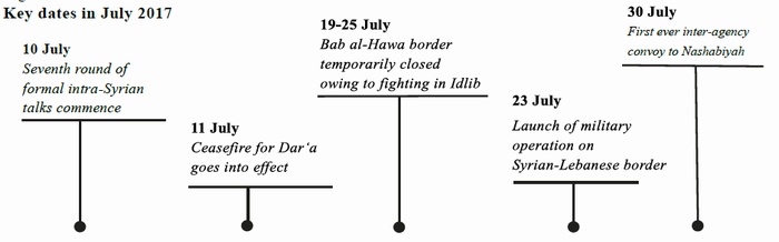 Key points in July 2017(1) Several international initiatives carried out in July were focused on reducing violence and supporting a political solution for the Syrian Arab Republic, including the seventh round of formal intra-Syrian talks in Geneva, held from 10 to 14 July. A ceasefire initiative for an area including parts of Qunaytirah, Dar'a and Suwayda' Governorates in the south-western part of the country reportedly resulted in a significant drop in violence.