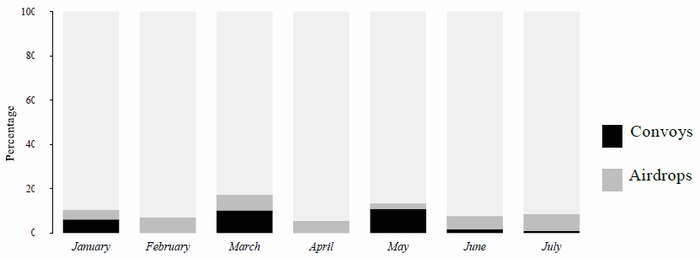 United Nations inter-agency cross-line humanitarian operations: percentage of people reached each month in besieged areas, including through airdrops to Dayr al-Zawr city