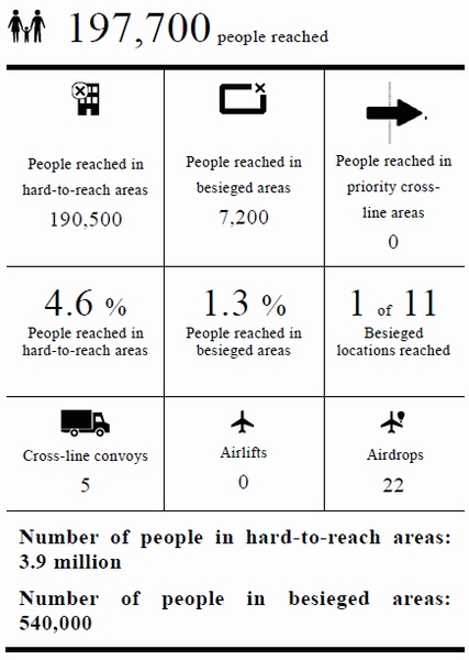 (4) As the besieged areas of the city cannot be accessed by land owing to the ISIL presence, the World Food Programme (WFP) completed 287 airdrops between April 2016 and the end of July 2017, dispatching approximately 5,570 metric tons of WFP mixed food commodities and other humanitarian supplies, including nutritional items, medical kits and basic relief items, on behalf of other humanitarian actors. The Syrian Arab Red Crescent ensures the distribution of the airdropped assistance.