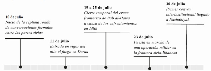 Aspectos destacados en julio de 20171) En julio se emprendieron varias iniciativas internacionales dirigidas a reducir la violencia y prestar apoyo a una solución política para la República Árabe Siria, entre ellas la séptima ronda de conversaciones oficiales entre las partes sirias, celebrada en Ginebra del 10 al 14 de julio. A raíz de una iniciativa de alto el fuego en una zona que abarcaba partes de las provincias de Quneitra, Deraa y As-Suwaida, en la parte sudoccidental del país, la violencia disminuyó considerablemente.