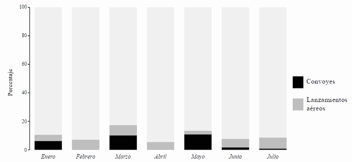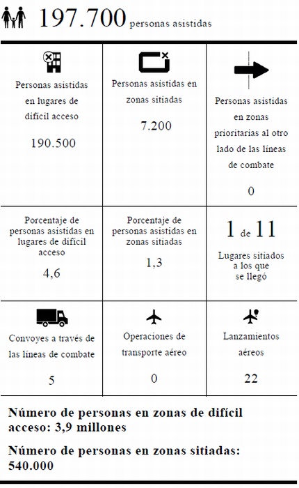 Operaciones humanitarias interinstitucionales de las Naciones Unidas a través de las líneas de combate: porcentaje de personas a las que se prestó asistencia cada mes en las zonas sitiadas, incluidos los lanzamientos aéreos en la ciudad de Deir Ezzor