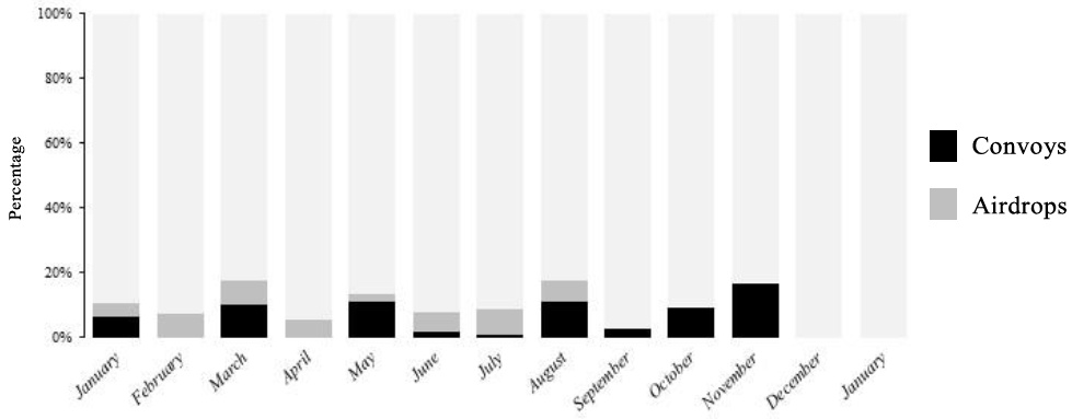 United Nations inter-agency cross-line humanitarian operations: percentage of people reached each month in besieged areas23. The United Nations and its partners continue to provide support to those who have been displaced by fighting in and around Raqqah as part of a coordinated response in the Syrian Arab Republic. The regular programming of United Nations agencies was put on hold for most of January, however, owing to restrictions from Syrian and local authorities. Local authorities in the north-east of the country held up humanitarian convoys twice at the checkpoint with government-controlled areas in eastern Aleppo, halting the supply route for assistance from within the Syrian Arab Republic to the region. Furthermore, local authorities required non-governmental organization (NGO) partners to register with the Kurdish Autonomous Administration. The situation was further compounded by the refusal of the governor of Hasakah to issue facilitation letters for United Nations deliveries. While an agreement was reached with all parties to allow the resumption of humanitarian activity on 30 January, assistance was restricted for much of the month.