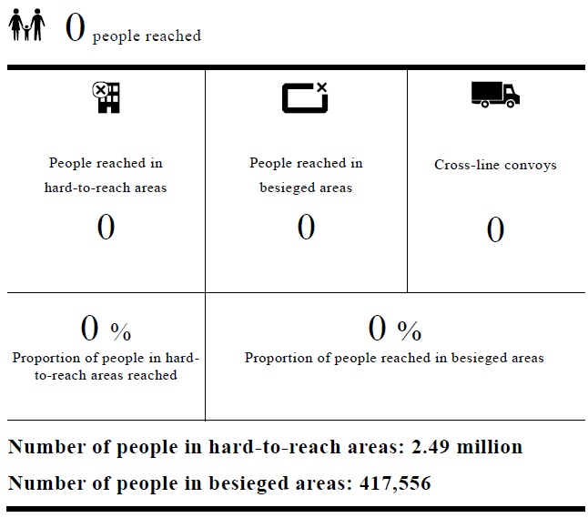 6. In January, United Nations humanitarian assistance reached millions of people in need in the Syrian Arab Republic, including nearly 2 million people who received food assistance through regular deliveries. Access to besieged areas continued to be a challenge, with no convoys to any besieged area for the second month in a row.