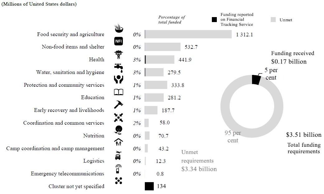 33. As at 31 January, the 2018 humanitarian response plan for the Syrian Arab Republic was 4.8 per cent funded, with $168 million of the $3.51 billion requested under the plan received.