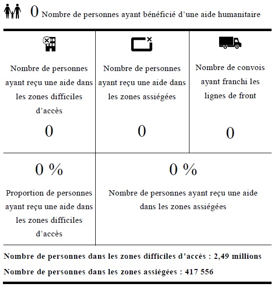 Opérations humanitaires interinstitutions des Nations Unies menées dans des zones situées au-delà des lignes de front : pourcentage de la population ayant bénéficié d'une aide dans des zones assiégées (par mois)23. L'ONU et ses partenaires continuent d'apporter une aide à ceux qui ont été déplacés à cause des combats à l'intérieur et aux alentours de Raqqa, dans le cadre d'une intervention coordonnée en République arabe syrienne. Toutefois, le programme ordinaire des organismes des Nations Unies a été mis en attente pendant la plus grande partie du mois de janvier en raison des restrictions imposées par les pouvoirs publics et les autorités locales. Les autorités locales dans le nord-est du pays ont immobilisé deux fois des convois humanitaires au point de contrôle des zones sous contrôle gouvernemental dans l'est de la province d'Alep, coupant ainsi la voie d'approvisionnement de l'aide fournie à la région de l'intérieur de la République arabe syrienne. Par ailleurs, les autorités locales ont exigé que les organisations non gouvernementales partenaires se fassent enregistrer auprès de l'Administration autonome kurde. La situation a encore été aggravée par le refus du gouverneur de Hassaké de délivrer des lettres d'agrément pour les livraisons des Nations Unies. Si un accord a fini par être conclu avec toutes les parties pour permettre la reprise de l'activité le 30 janvier, l'aide n'en a pas moins été restreinte pendant la plus grande partie du mois.