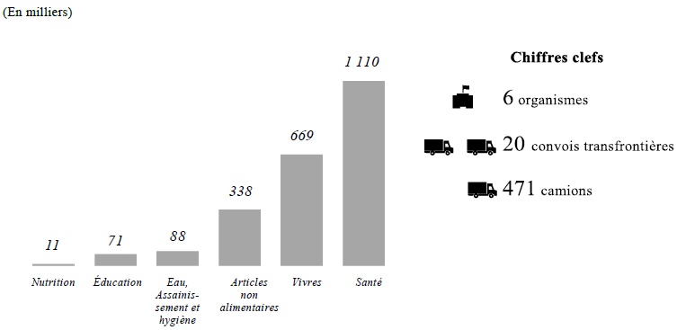 Organisation Nombre de personnes ayant reçu une aide Organisation des Nations Unies pour l'alimentation et l'agriculture 20 000 Organisation internationale pour les migrations 60 489 Haut-Commissariat des Nations Unies pour les réfugiés 2 688 000 Fonds des Nations Unies pour l'enfance 1 300 000 Programme des Nations Unies pour le développement 105 178 Fonds des Nations Unies pour la population 330 000 Office de secours et de travaux des Nations Unies pour les réfugiés de Palestine dans le Proche-Orient 360 000 Programme alimentaire mondial 2 400 000 Organisation mondiale de la Santé 826 000 25. Au cours de la période considérée, les livraisons transfrontières depuis la Turquie et la Jordanie vers la République arabe syrienne se sont poursuivies en application des résolutions 2165 (2014), 2191 (2014), 2258 (2015), 2332 (2016) et 2393 (2017) du Conseil de sécurité (pour plus de détails, voir fig. IV). Conformément à ces résolutions, l'Organisation a notifié à l'avance chaque livraison aux autorités syriennes, en précisant quels en étaient le contenu et la destination, ainsi que le nombre de bénéficiaires prévus.
