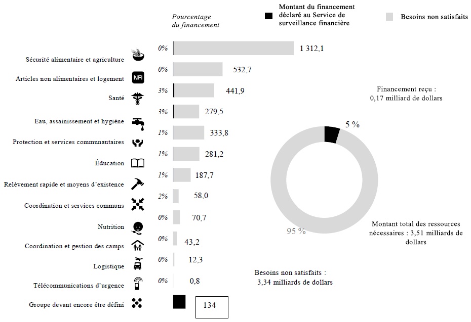 33. Au 31 janvier, le plan d'intervention humanitaire pour la République arabe syrienne avait été financé à 4,8 %, soit 168 millions de dollars sur les 3,51 milliards demandés dans le cadre du plan.
