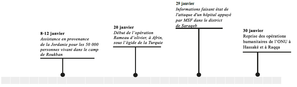 - Le 18 janvier, des frappes aériennes auraient touché l'hôpital psychiatrique de la ville d'Izaz contrôlée par l'opposition dans le nord-ouest d'Alep et 11 patients auraient été blessés. Ce centre accueille près de 200 patients.