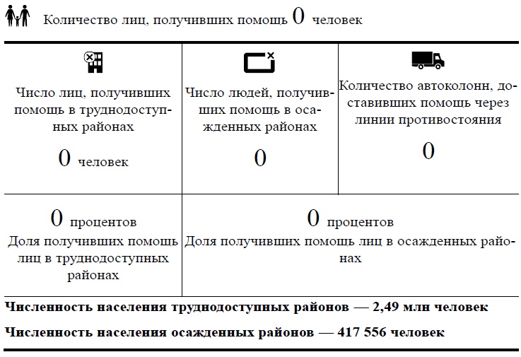 Основные факты, январь 2018 года1. В течение отчетного периода военные действия в разных районах страны имели серьезные негативные последствия для гражданского населения и стали причиной гибели, ранений и вынужденного перемещения людей, нанесения дополнительного ущерба объектам гражданской инфраструктуры, в частности больницам и школам, и отрицательно сказались на возможностях учреждений Организации Объединенных Наций и их партнеров по доставке жизненно необходимой гуманитарной помощи.