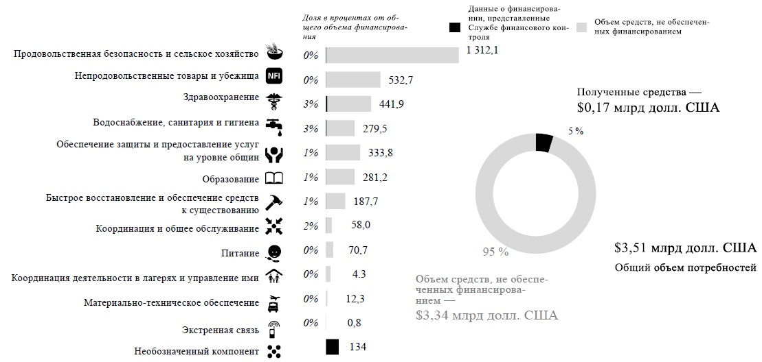 33. По состоянию на 31 января план оказания гуманитарной помощи Сирийской Арабской Республике в 2018 году был обеспечен финансированием на 4,8 процента: из предусмотренной в плане суммы в размере 3,51 млрд долл. США были получены средства на сумму в 168 млн долл. США.