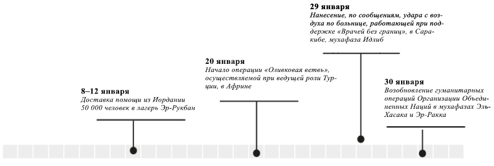 - 18 января были нанесены удары с применением средств наземного базирования по психиатрической больнице в находящемся под контролем оппозиции городе Аазаз в северо-западной части Алеппо, в результате чего, по сообщениям, были ранены 11 пациентов. В больнице находится около 200 пациентов.