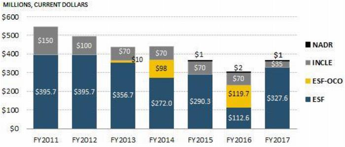 Notes: All amounts are approximate. Amounts stated for FY2016 have been appropriated but may remain subject to future obligation. Amounts stated for FY2017 have been requested, with ultimate FY2017 appropriation and allocation amounts to be determined. NADR = Nonproliferation, Antiterrorism, Demining and Related Programs, INCLE = International Narcotics Control and Law Enforcement, ESF = Economic Support Fund, OCO = Overseas Contingency Operations.Additional U.S. humanitarian assistance for Palestinian refugees in Gaza and elsewhere continues through contributions to the U.N. Relief and Works Agency for Palestine Refugees in the Near East (UNRWA). U.S. contributions to UNRWA, which have totaled more than $5.6 billion since UNRWA's inception in 1950 (see Table 1 below), have averaged over $250 million annually since 2007.