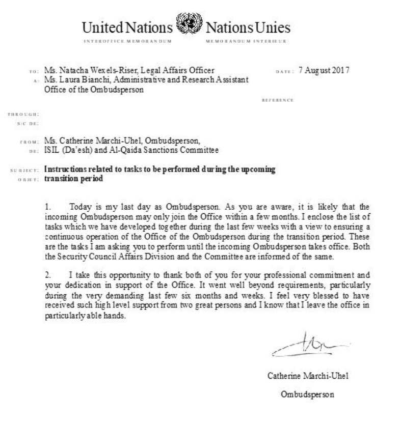 Letter from the Ombudsperson dated 7 August 2017Tasks to be completed upon prior instruction of the outgoing Ombudsperson